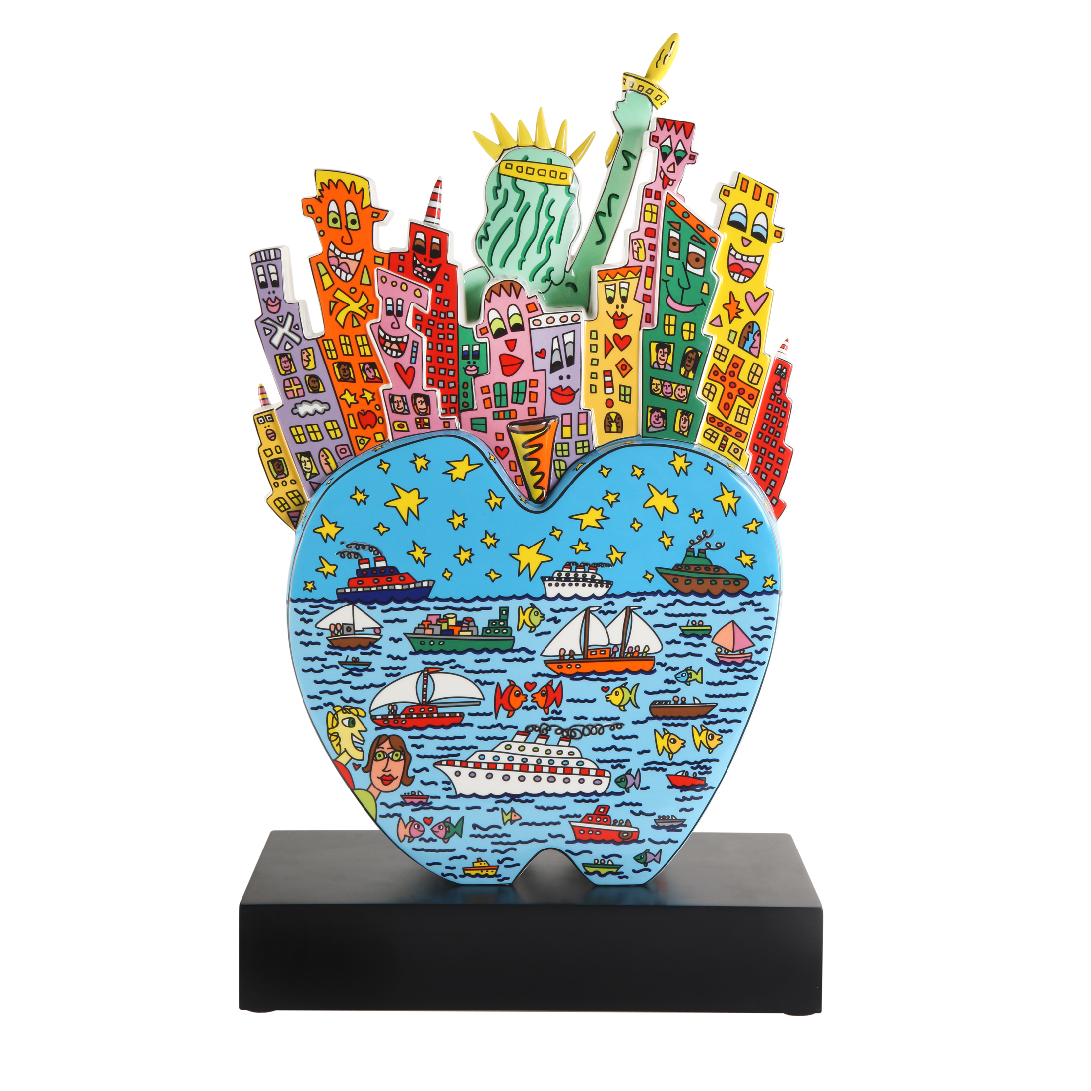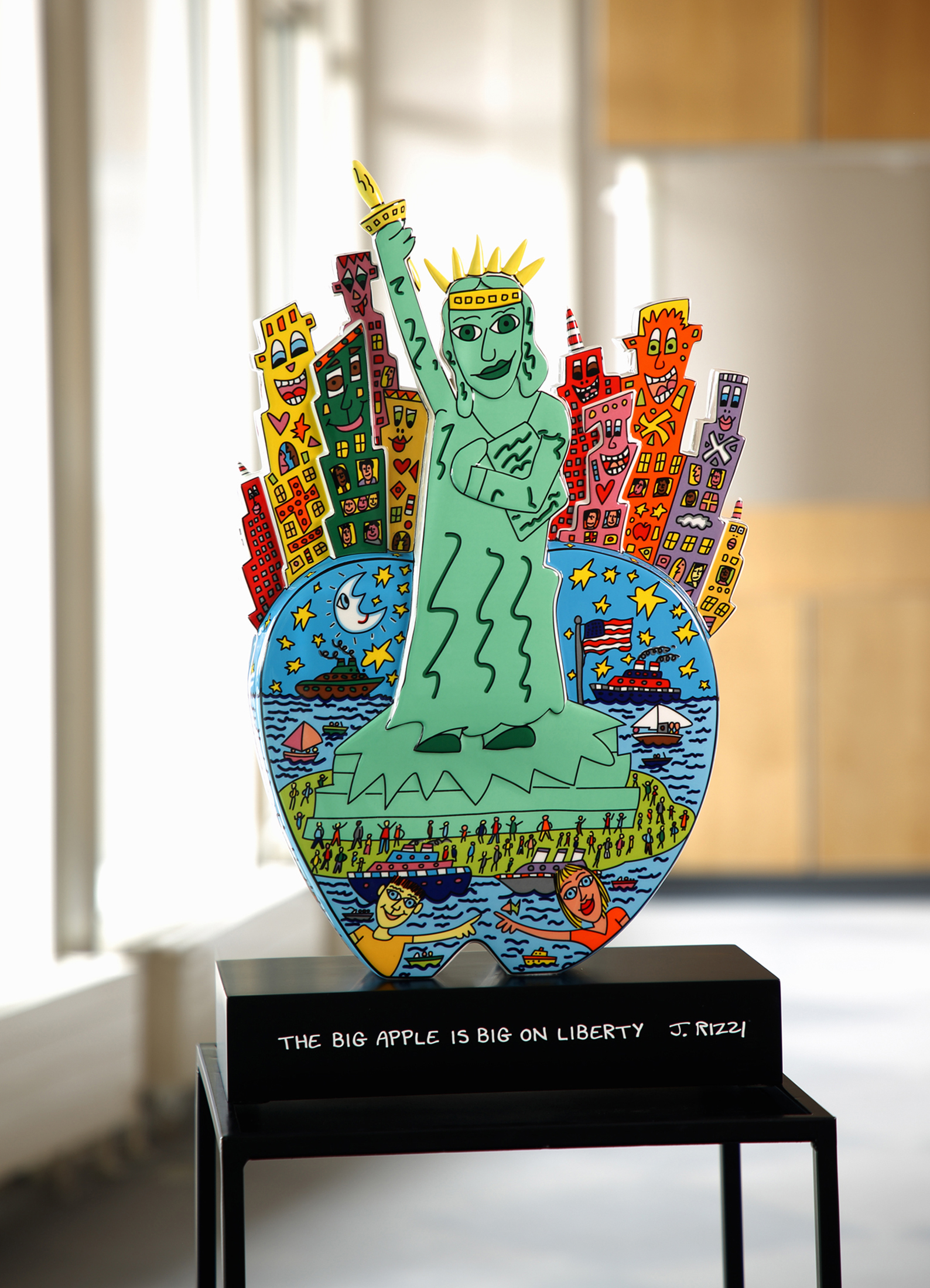 James Rizzis Faible galt dem Stadtleben New Yorks, der Millionenmetropole, die niemals schläft. Faszinierende Eindrücke dienen als Vorlage für Deko-Objekte und limitierte Kunstwerke, wie für „Big Apple on Liberty“. Die auf 499 Stück limitierte und beidseitig unterschiedlich dekorierte Figur auf schwarzem Holzpostament ist ein interessanter Blickfang.